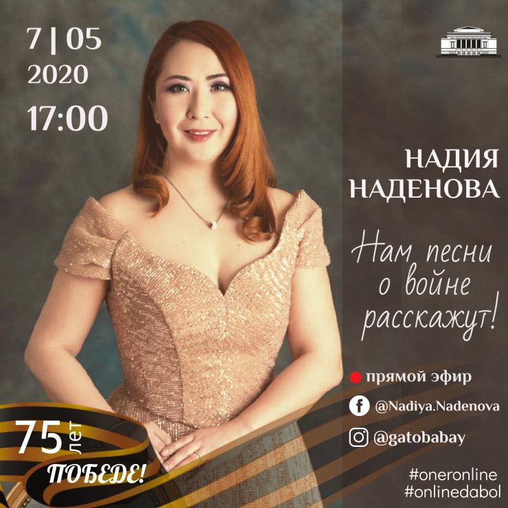 Сегодня, 7 мая, в 17.00 с концертной программой "Нам песни о войне расскажут" в прямой эфир на страницах Facebook (Nadiya.Nadenova) и Instagram (@gatobabay) выйдет Надия Наденова (сопрано). Надия - дипломант международных конкурсов вокалистов и лауреат международных премий, исполняет ведущие партии в репертуаре театральных постановок, принимает активное участие в концертной деятельности.