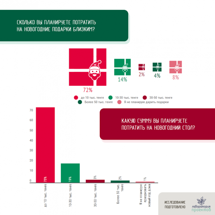 О том, сколько казахстанцы планируют потратить на подарки близким к Новому году и как будут встречать праздник, выяснила аналитическая компания "Лаборатория проектов", передает корреспондент Tengrinews.kz.