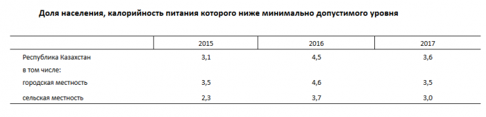 Также, согласно информации ведомства, в 2017 году уровень пищевой депривации, или доля населения, калорийность питания которого ниже минимально допустимого уровня, снизился по сравнению с прошлым годом на 1,1 процентных пункта и составил 3,6 процента.