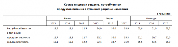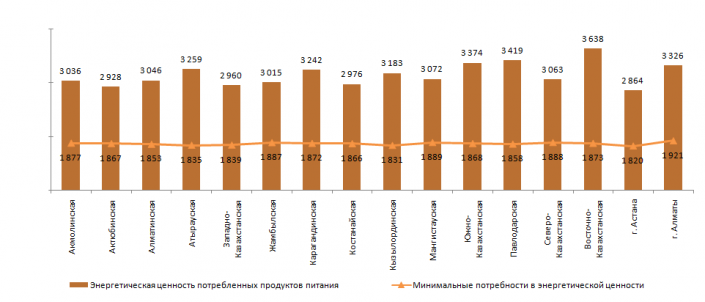 "Можно отметить, что питание населения в сельской местности более калорийно чем в городской. Рассматривая региональное потребление, следует отметить, что во всех регионах страны уровень фактической энергетической ценности потребленных населением продуктов питания превышает уровень минимальных потребностей в энергетической ценности. Самый высокий уровень энергетической ценности, потребленных населением продуктов питания отмечается в Восточно-Казахстанской области, а самый низкий - в Астане", - комментируют в ведомстве.