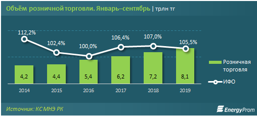 За январь-сентябрь этого года объем розничной торговли составил 8,1 триллиона тенге - на 5,5 процента больше, чем в соответствующем периоде 2018 года (7,2 триллиона тенге). А в сельской местности наторговали на 676,2 миллиарда тенге.