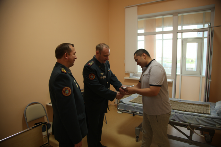 "Так как вы завтра уезжаете в свою воинскую часть, мы рады вам вручить офицерские погоны, чтобы прибыли на свое место службы уже офицером", - сказал заместитель начальника Главного управления воспитательной и социальной и социально-правовой работы Александр Крамар, вручая Сундетову погоны в военном госпитале.