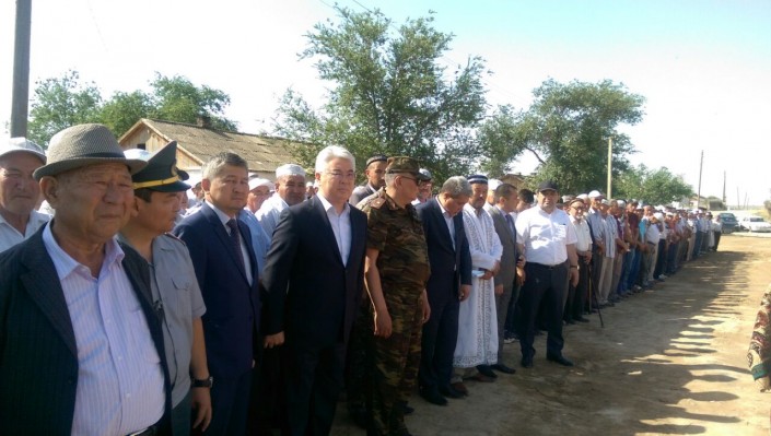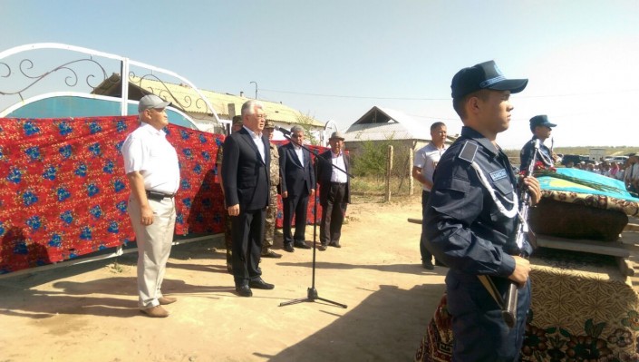 В последний путь проводить отважного военнослужащего пришел весь аул, к соболезнованиям присоединились аким ЮКО Бейбут Атамкулов и заместитель главнокомандующего Нацгвардии РК Мухаметкали Сатов.