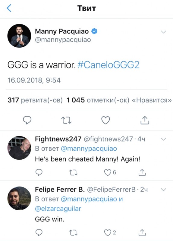 Мэнни Пакьяо в своем аккаунте в Twitter высказал свое мнение о том, кто стал победителем боя.