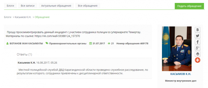 Министр внутренних дел Калмуханбет Касымов на портале "Открытый диалог" прокомментировал инцидент в Темиртау с участием полицейского, выталкивавшего посетителя супермаркета, передает Tengrinews.kz.