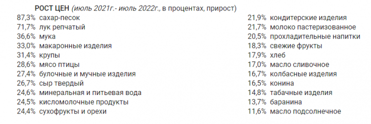 По данным ведомства, цены на продовольственные товары в июле по сравнению с июлем прошлого года повысились на 19,7 процента, на непродовольственные товары выросли на 14,2 процента, на платные услуги - на 9,2 процента.