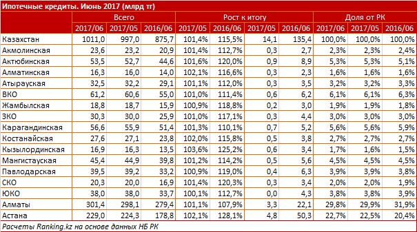 Сообщается, что самый значительный месячный прирост ипотечного портфеля отмечен в столице - сразу 4,8 миллиарда тенге, до 229 миллиардов. Также в тройку лидеров по наращению ипотечных объемов вошли Алматы (3,3 миллиарда тенге за месяц, до 301,4 миллиарда) и Актюбинская область (855 миллионов, до 53,5 миллиарда).