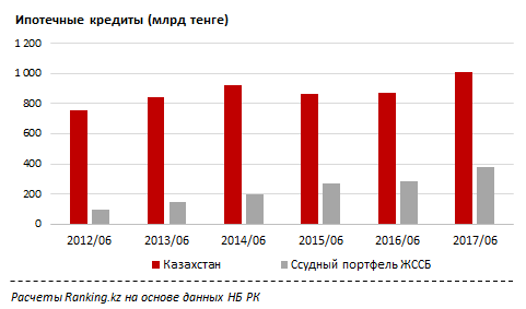 По данным СМИ, немалое влияние на ипотеку оказала госпрограмма "Нурлы Жер", запущенная с начала 2017 года в рамках "Прогнозной схемы территориально-пространственного развития". Так, ссудный портфель одного из ключевых операторов госпрограммы, Жилстройсбербанка, по итогам июля составлял 376,3 милиарда тенге - рост на 3,5 процента за месяц и сразу на 32,2 за год. Это уже 37,2 процента от всего ипотечного портфеля по РК.