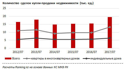 Оживление ипотечного рынка ожидаемо сказалось и на активизации рынка жилья. Так, в июле 2017 казахстанцы совершили 19,49 тысячи сделок купли-продажи недвижимости - это сразу на 26,1 процента больше, чем в соответствующем месяце прошлого года. При этом квартирами в многоэтажках казахстанцы интересуются больше - здесь число сделок выросло год-к-году сразу на 34,8 процента, до 13,25 тысячи. По индивидуальным домам количество сделок выросло за год на 14,1 процента, до 6,42 тысячи.