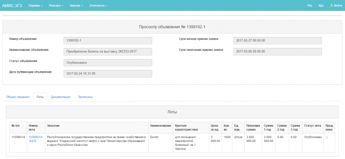 Так, Атырауский институт нефти и газа планирует купить 1 000 билетов на сумму три миллиона тенге. В объявлении указан срок начала приема заявок 27 февраля. Сроком окончания приема заявок является 6 марта.