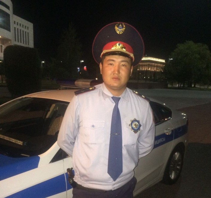 По словам Сагынбекова, он второй год служит в правоохранительных органах и пятый год живет в Астане. Родом он из Шымкента. На данный момент является младшим лейтенантом полиции, старшим инспектором службы шестого взвода.