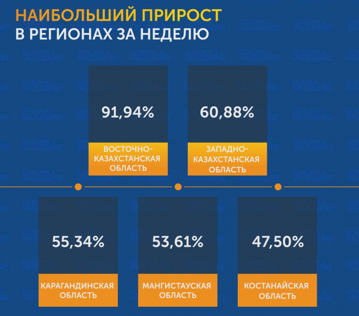 Наибольший прирост отмечается в Восточно-Казахстанской области - 91,94 процента за неделю. Серьезное увеличение числа заболевших также отмечается в Западно-Казахстанской, Карагандинской, Мангистауской и Костанайской областях.