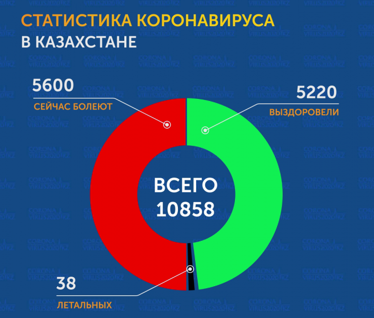 Общее число заражений в Казахстане составляет 10 858 случаев. На данный момент больными остаются 5600 человек. За сутки прирост составил 476 пациентов.