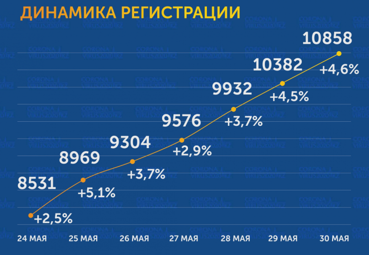 Темп прироста заболевших 30 мая за сутки по всей стране составил 4,6 процента. За прошедшие сутки в трех регионах Казахстана не нашли новых больных коронавирусом