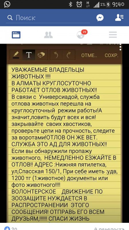 В социальной сети Facebook распространяют информацию о круглосуточном отлове собак в Алматы в преддверии зимней Универсиады. Авторы сообщения призывают владельцев питомцев не выпускать животных на улицу, так как якобы их отлавливают круглые сутки.