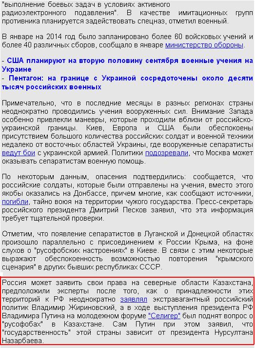Особого внимания заслуживает не сам информационный повод этой новости, а его подача. В так называемом "бэкграунде" текста, где обычно издания напоминают о связанных с темой новостях, NEWSru.com указали сведения об украинском кризисе и о заявлении Путина на "Селигере". Издание утверждает, что во время выступления российский лидер поднял вопрос о "русофобах в Казахстане". Кроме того, в тексте упоминается громкое высказывание депутата ЛДПР Владимира Жириновского. Цитата: "Россия может заявить свои права на северные области Казахстана, предположили эксперты после того, как о принадлежности этих территорий к РФ неоднократно заявлял экстравагантный российский политик Владимир Жириновский".