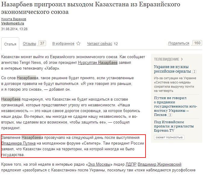 Тем не менее, многие российские СМИ начали утверждать, что заявление Назарбаева стало ответом на выступление Путина, чего, из-за разницы в датах, никак быть не могло. К примеру, на сайте газеты "Ведомости" появилась новость о том, что Глава Казахстана "пригрозил выходом из экономического союза". В нем указывается, что "заявление Назарбаева прозвучало на следующий день после выступления Владимира Путина на молодежном форуме "Селигер". При этом стоит отметить, что издание в новости ссылается на Tengrinews.kz, а именно на материал, опубликованный 25 августа, за четыре дня до выступления Путина.