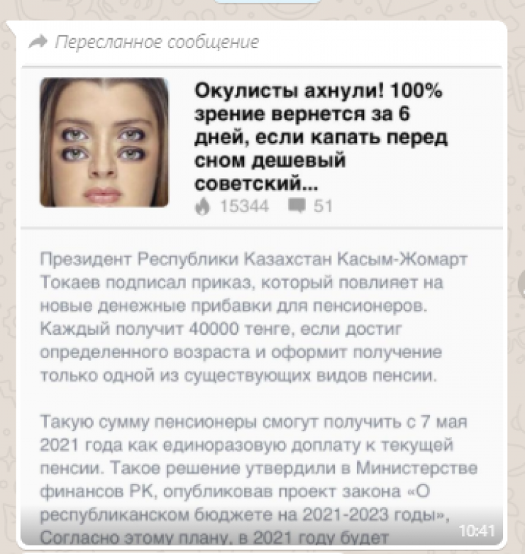 Казахстанцы распространяют в WhatsApp сообщение о том, что в мае все пенсионеры получат надбавку к пенсии в размере 40 тысяч тенге, передает Tengrinews.kz со ссылкой на StopFake.kz.