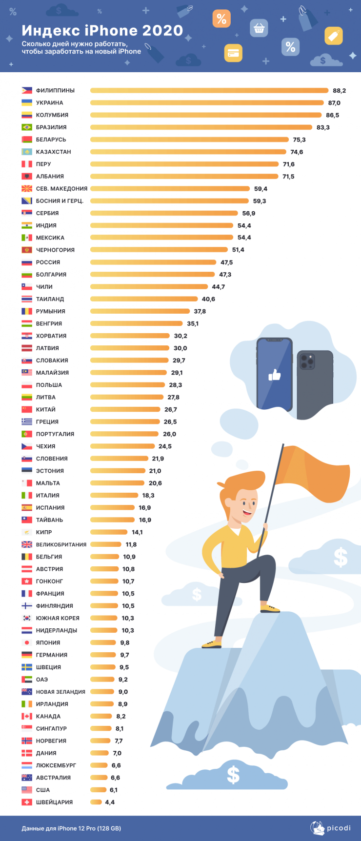К слову, в Швейцарии, США и Австралии высокий уровень доходов позволяет заработать на новый iPhone чуть больше чем за четыре и шесть дней.