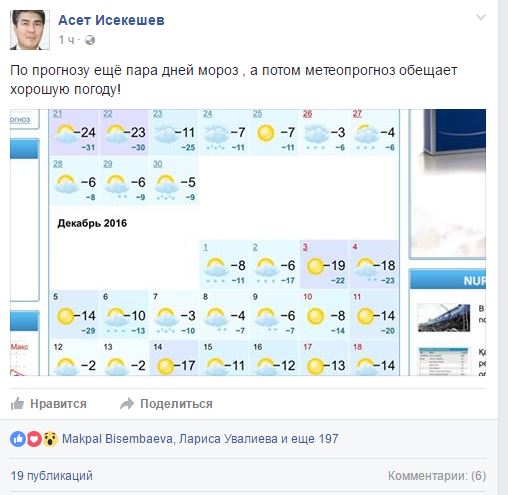 Аким Астаны Асет Исекешев на своей странице в Facebook подбодрил горожан новостями о предстоящей хорошей погоде, передает корреспондент Tengrinews.kz
