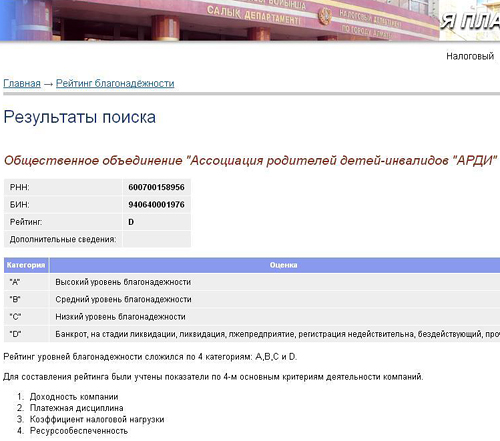 Дело в том, что если ввести РНН 600700158956 и БИН 940640001976, принадлежащие ОО "Ассоциация родителей детей-инвалидов "АРДИ", в специальную форму в разделе портала НДА "Проверь компанию на благонадежность" , то пользователь увидит, что этому НПО присвоен рейтинг благонадежности D. Оценка расшифровывается как "предприятие банкрот," "на стадии ликвидации", "ликвидация", "лжепредприятие", "регистрация недействительна", "бездействующий". Также к этой категории относят и прочие организации, которые по разным причинам не могут быть занесены в более высокие категории по показателям доходности компании, платежной дисциплины, коэффициента налоговой нагрузки или ресурсообеспеченности.