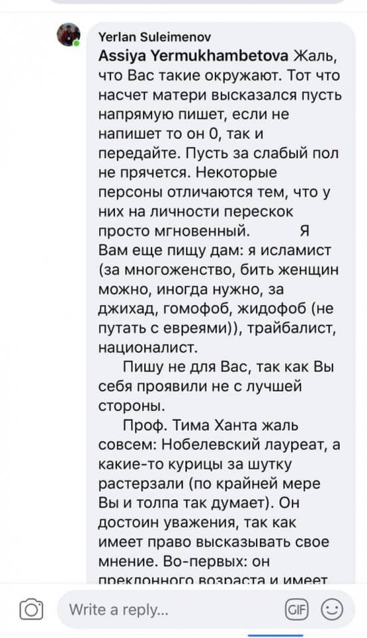 Позже автор поста Асия Ермухамбетова призвала пользователей Facebook обратить внимание на комментарии Ерлана Сулейменова.