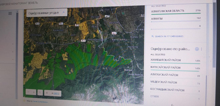 "На этом снимке с базы Qoldau ярким зеленым фоном отображены оцифрованные сельскохозяйственные угодья, которые уже ранее кому-то предоставлены под пастбище на срок до 49 лет! Отданы самые красивые предгорья и горы Иле-Алатауского национального парка с естественной средой обитания диких животных, птиц от границ Жамбылской области и Республики Кыргызстан до предгорья и горной местности Национального парка "Иле-Алатау" в районе Енбекшиказахского района Алматинской области", - сообщил Базарбек.