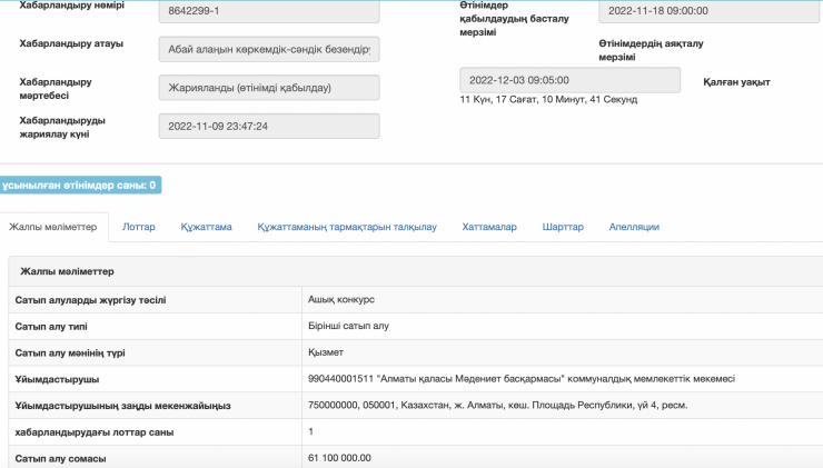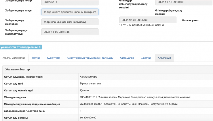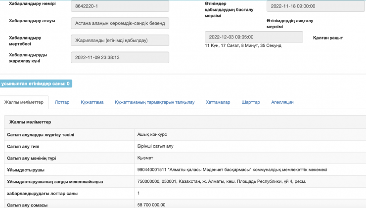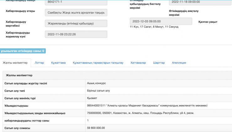 "Алматы қаласы Мәдениет басқармасы" коммуналдық мемлекеттік мекемесі "Жаңа жыл" мерекелік іс-шарасын безендіру жұмысы үшін 59 миллион 600 мың теңгеге лот жариялаған.