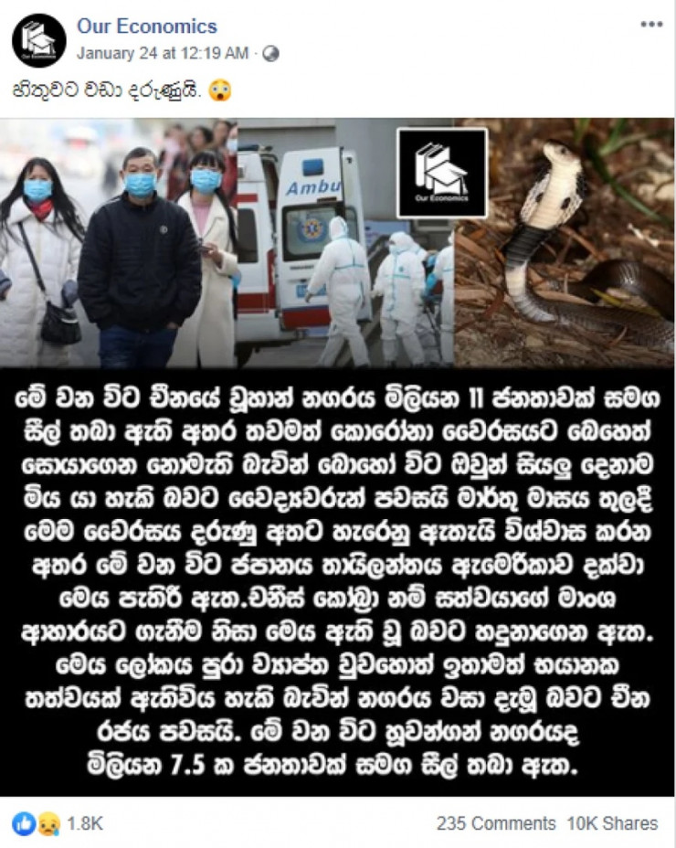 Шри-Ланкада әлеуметтік желі қолданушылары тағы бір қауесет тарата бастаған. Олар коронавирустан миллиондаған адамның қайтыс болатынын айтып үрейлендірген. Сондай-ақ олар дәрігерлерге сілтеме жасап, 11 миллион тұрғыны бар Уханның басым бөлігі көз жұмады деп қауесет таратқан.