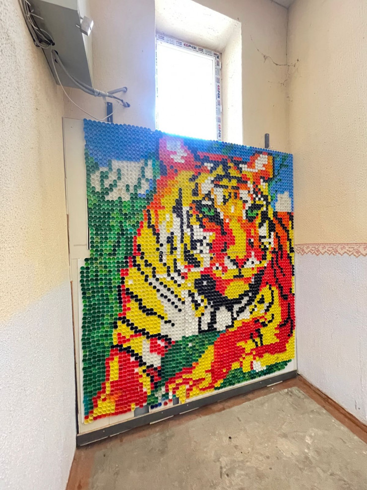 "Я раньше работал на местном комбинате. Был слесарем и мастером. Увлекался резьбой по дереву. Выйдя на пенсию, стал заниматься созданием картин из пластиковых крышек. Некоторые выкладывают из них дорожки на дачах, а я украсил свой подъезд. Начал еще во время пандемии. Первая моя работа – глаза в маске. Тогда же все носили маски - это было символично. Потом появились остальные картины. Я выложил полы и стены крышками, получилось как мозаика. В прошлом году создал картину барса, в этом - зайца. Соседям нравится", - рассказывает Юрий.