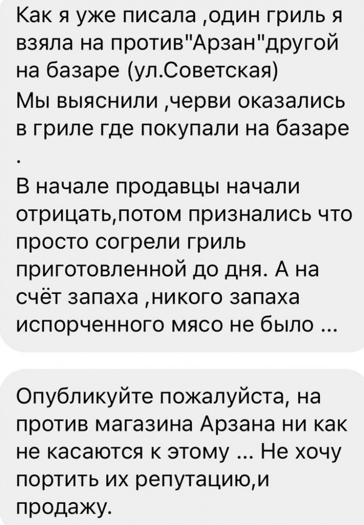 "Вчера купила гриль, один на базаре, другой напротив магазина "Арзан" (базар). Вот что внутри, у меня просто нет слов... Хочу, чтобы наш народ знал, что мы едим и на что тратим свои деньги! Эти люди не боятся Всевышнего Аллаха! Неизвестно, сколько еще людей купили", - подписала она ролик.