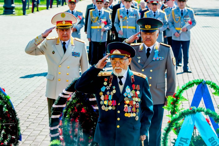 13.52 Во главе колонны сотрудников полиции в Усть-Каменогорске прошел 95-летний участник Великой Отечественной войны Курмат Рахимович Рахимов. До этого он несколько лет смотрел праздничные мероприятия только по телевизору. В этом году дедушка твердо решил, что должен встретить 9 Мая в строю.