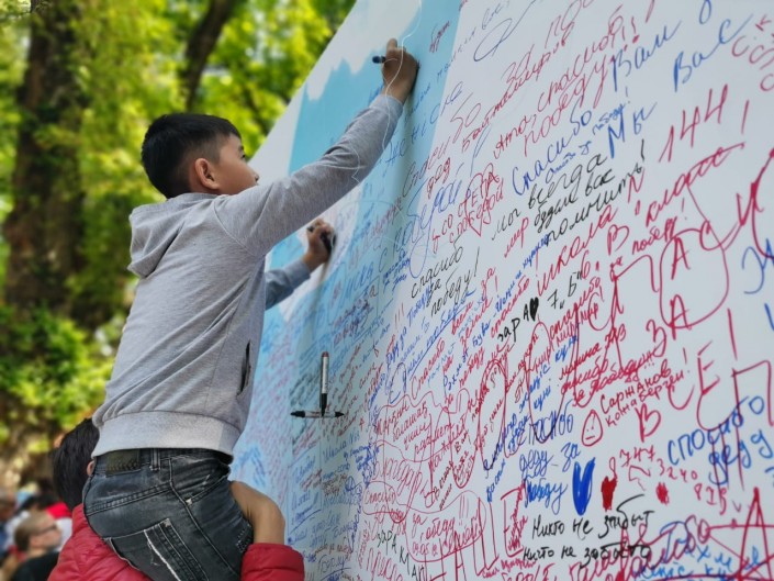 12.38. Алматы. Девочка пишет слова благодарности. "Ата, спасибо за победу!", "Мы всегда будем вас помнить", "Спасибо вам за мир!", - пишут юные жители города на стенде в парке имени 28 гвардейцев-панфиловцев.