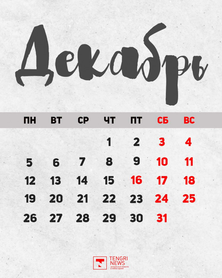 В декабре у казахстанцев будет 21 рабочий и 10 выходных дней.