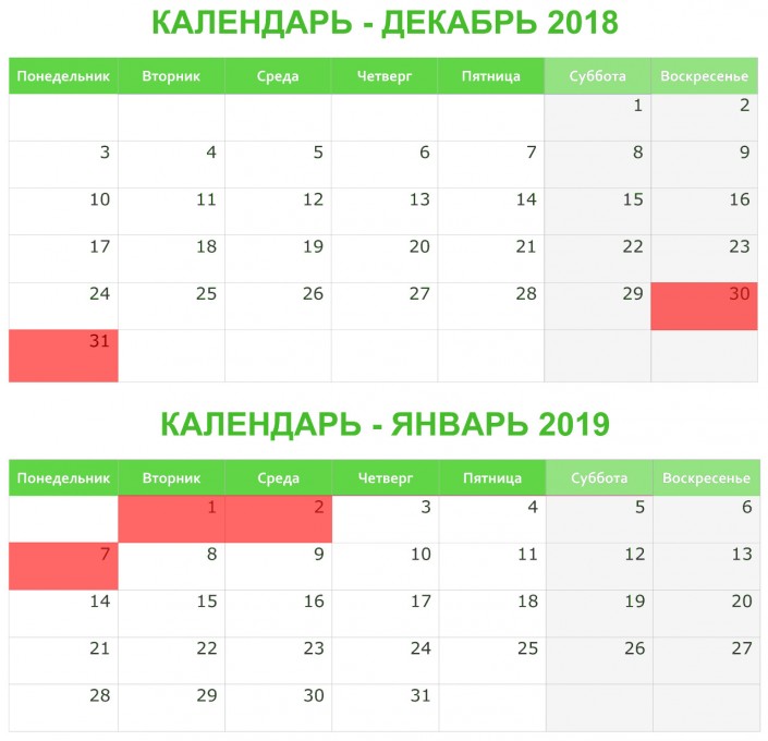 Праздничные и выходные дни в канун празднования Нового года выпадают на 30 декабря, воскресенье, и 31 декабря, понедельник, а также на 1 и 2 января - вторник и среду соответственно.
