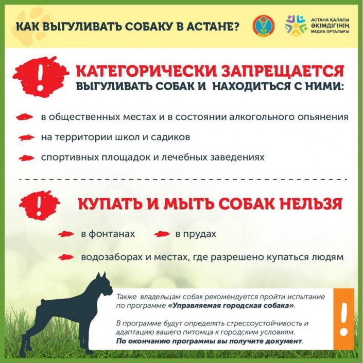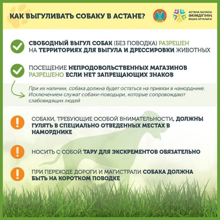 Правила и ограничения для собак и их владельцев в виде инфографики опубликовала на своей странице в Facebook пресс-секретарь акима Астаны Эльвира Жургенбаева.