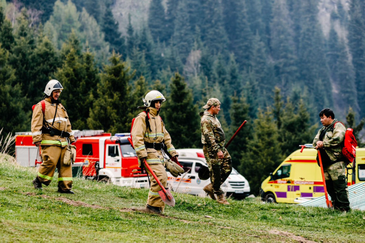 Задействовано: два вертолета АО "Казавиаспас" осуществлено 30 сбросов (90 тонн), также задействован вертолет МИ-8 МТВ Службы Спасения акимата Алматы. На месте работают 62 сотрудника и пять единиц техники ДЧС, сотрудники ГНПП - 42 человека.