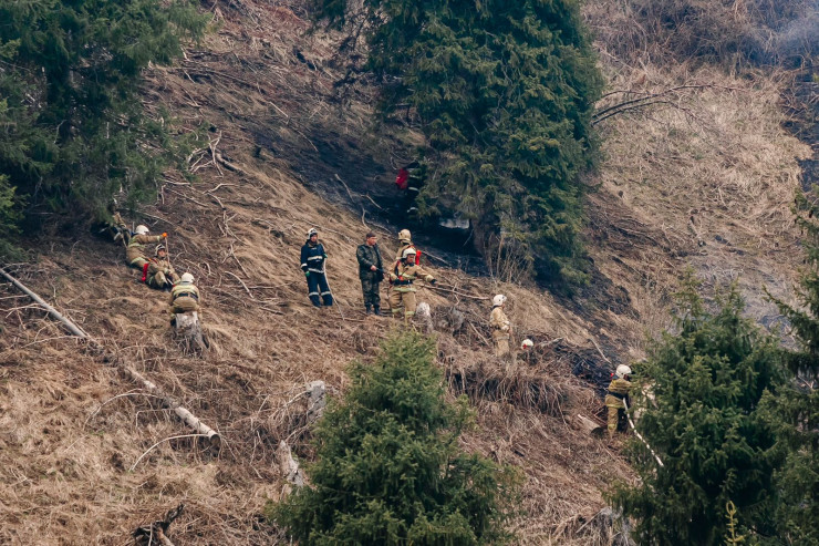 На участке у склона "Горельника", по словам корреспондента, работают 60 пожарных с водным рюкзаком по 20 литров. Они поднимаются на склон.