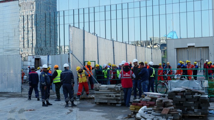 К 11 часам утра к строящемуся объекту съехались пожарные машины. Здесь уже был выстроен отряд спасателей. Служба пожаротушения и аварийно-спасательных работ столичного ДЧС устроила учения. Два года назад у этого объекта можно было увидеть почти такое же скопление пожарных и машин. Но тогда тушили реальный пожар на 25-м этаже. Сегодня условное возгорание ликвидируют на 33-м.