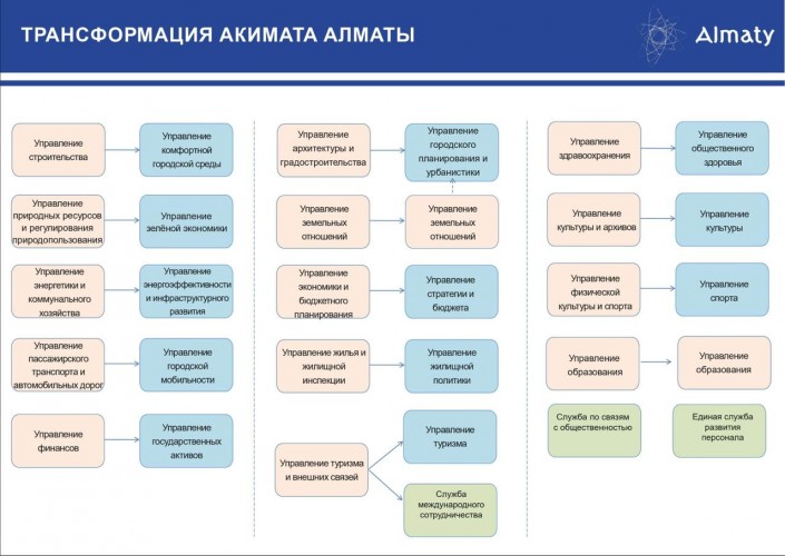 Сообщается, что в результате трансформации будет полностью перестроена работа всех управлений и районных акиматов. Шесть управлений и вовсе упразднят. Их функции передадут в другие структурные подразделения. Считается, что это позволит уменьшить управленческие и вспомогательные должности и перенаправить высвободившиеся единицы для усиления управлений, тесно работающих с населением.