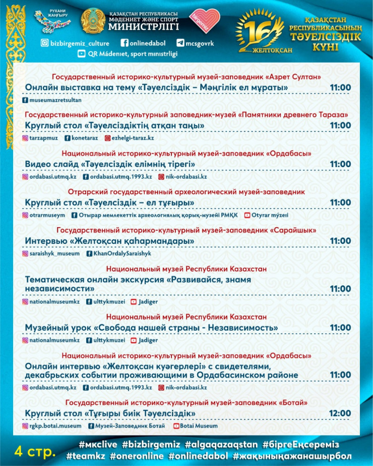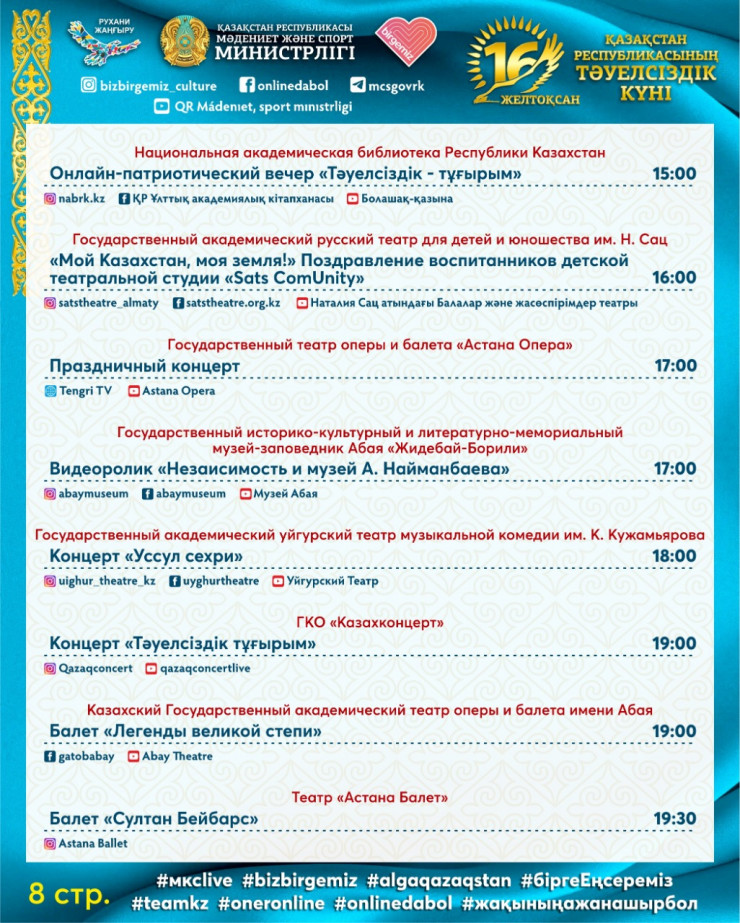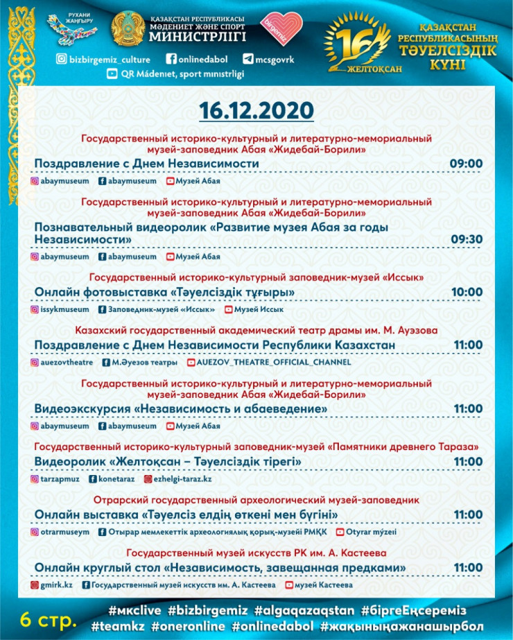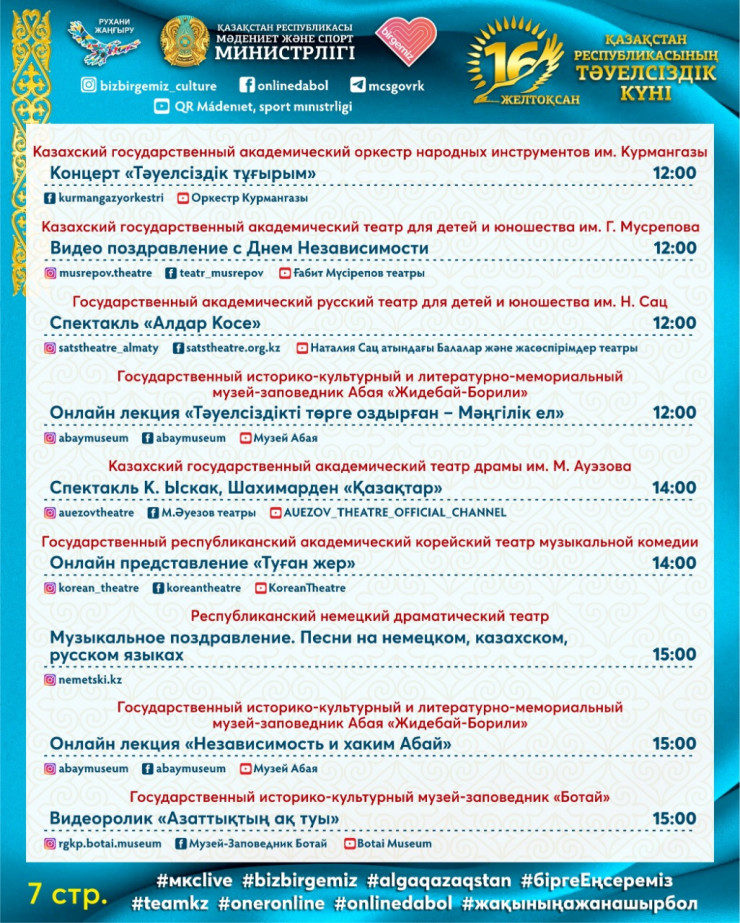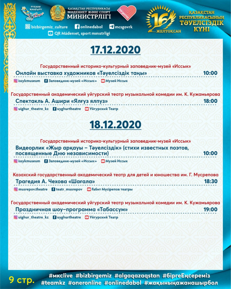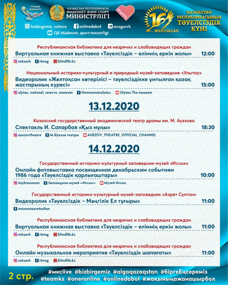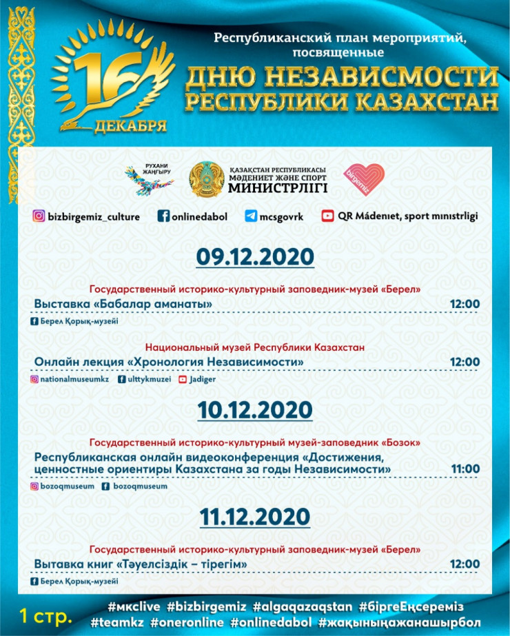 Одним из центральных мероприятий будет праздничный концерт "Ұлы дала – Тәуелсіз ел!", посвященный Дню независимости Республики Казахстан, которая состоится в онлайн-формате 16 декабря на одном из республиканских каналов.