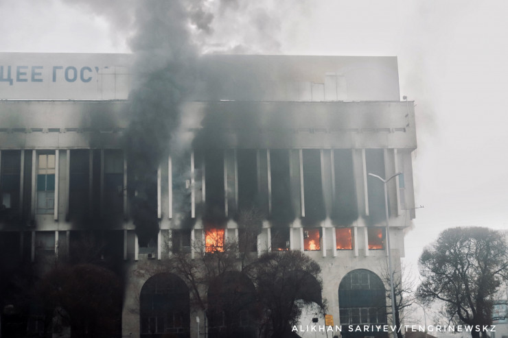 По словам корреспондента, здание городского акимата Алматы 6 января продолжало дымиться и гореть.