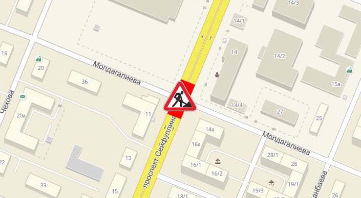 • 5 и 6 июля - пересечение улицы Молдагалиева и проспекта Сейфуллина. Автобусы №№106, 18, 34, 72, 85 будут ездить в прямом и обратном направлении по Сейфуллина - Майбороды - Акан Серы - Шолохова и далее по своему маршруту. Троллейбус №7 - разворот на остановке "Поселок Мехзавода".
