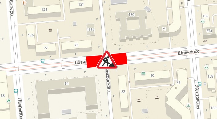• 1 и 2 июля - пересечение улиц Шевченко и Чайковского. Общественный транспорт будет ездить по улицам Кунаева - Фурманова - Курмангазы и далее движение будет осуществляться по маршруту.