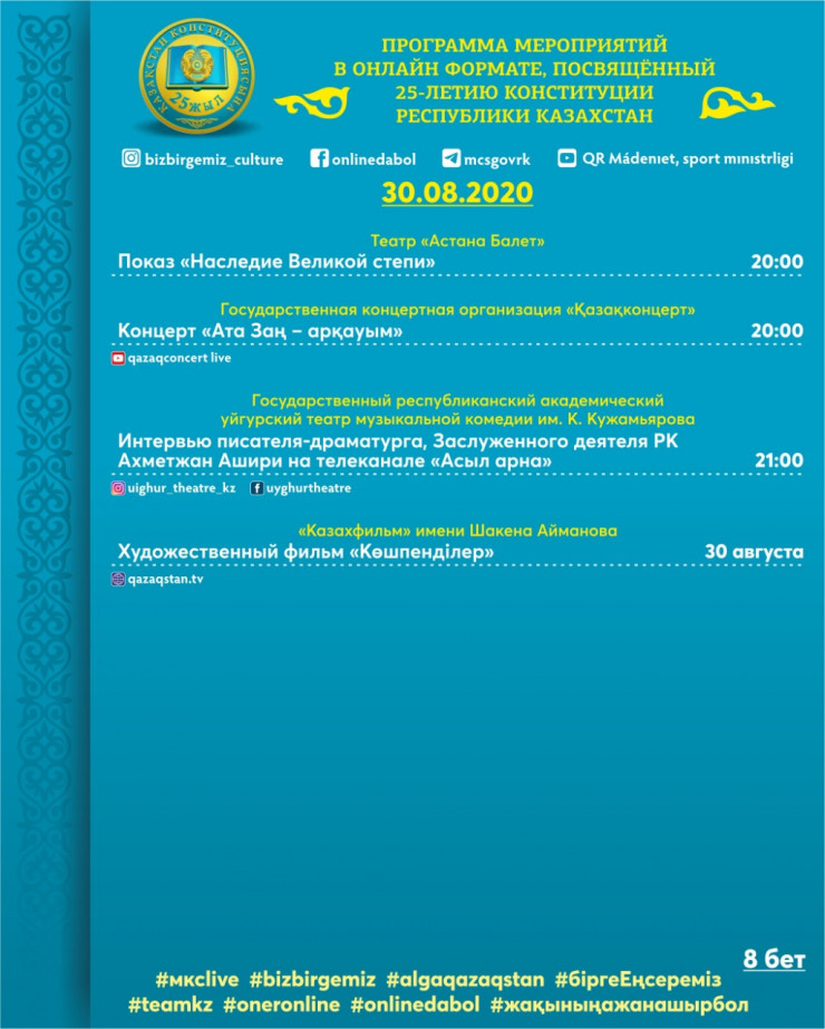 Финалом будет служить концертная программа "Тәуелсіздік тірегі - Ата заң", посвященная 25-летию Конституции Республики Казахстан, которая состоится в онлайн-формате в 11.30 на телеканале "Хабар".