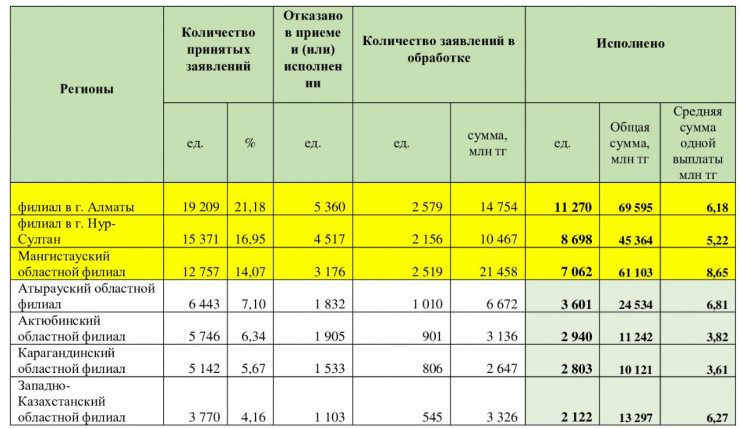 В Мангистауской области принято 12 757 заявлений на получение ЕПВ (14 процентов). 7062 заявления исполнены –  более 61 миллиарда тенге переведено вкладчикам на улучшение жилищных условий. Средняя сумма выплат в области составила 8,65 миллиарда тенге. Ждут исполнения еще 2519 заявлений на общую сумму почти 21,5 миллиарда тенге.