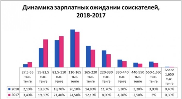 Далее зарплатные ожидания сложились следующим образом: 18,7 процента готовы выйти на работу, если в трудовом договоре будет прописана сумма от 82,5 до 110 тысяч. 14,8 процента кандидатов намерены зарабатывать от 165 до 220 тысяч тенге, 11,7 процента - от 220 до 330.