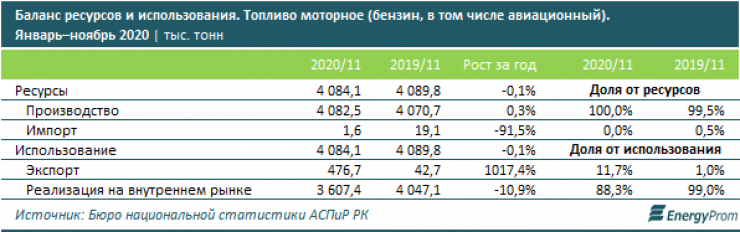 Спрос (экспорт плюс реализация на внутреннем рынке) по итогам 11 месяцев 2020 года практически полностью обеспечили отечественные компании. На долю экспорта пришлось 11,7 процента, против 1 процента годом ранее. Казахстан отправил на внешние рынки уже 476,7 тысячи тонн бензина.