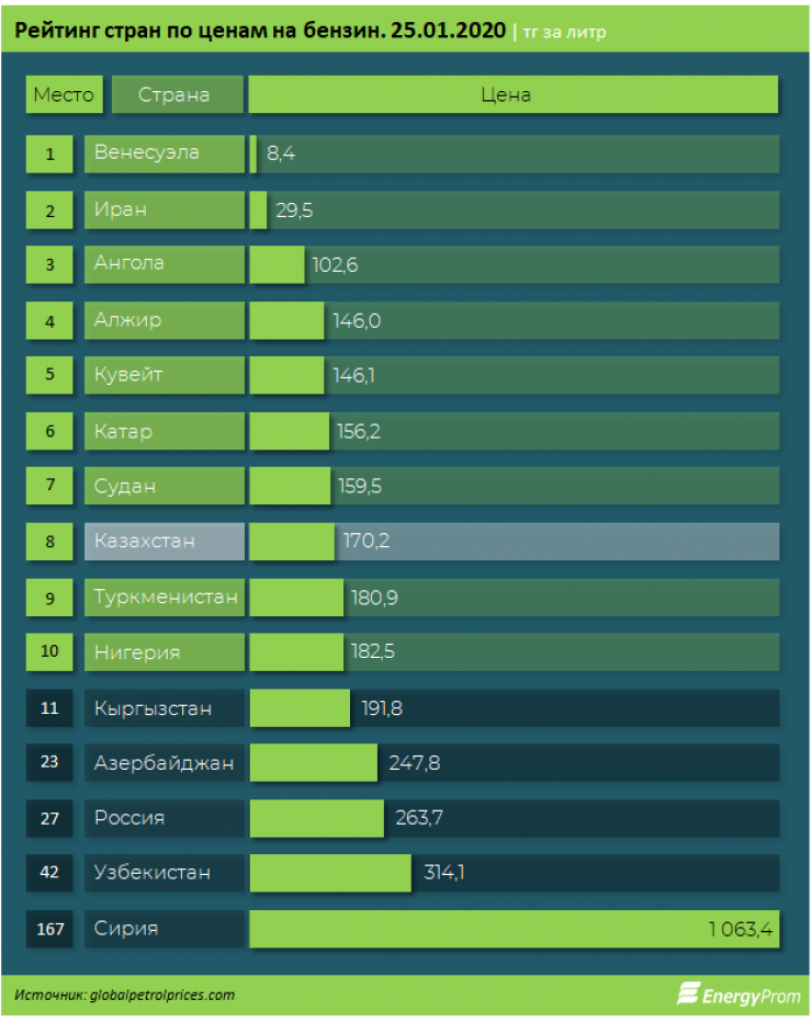 Всего в рейтинге участвовало 167 стран. Открывают рейтинг страны с самым дешевым бензином - Венесуэла, Иран и Ангола. Здесь бензин стоит в тенговом эквиваленте от 8,45 до 103,15 тенге.
