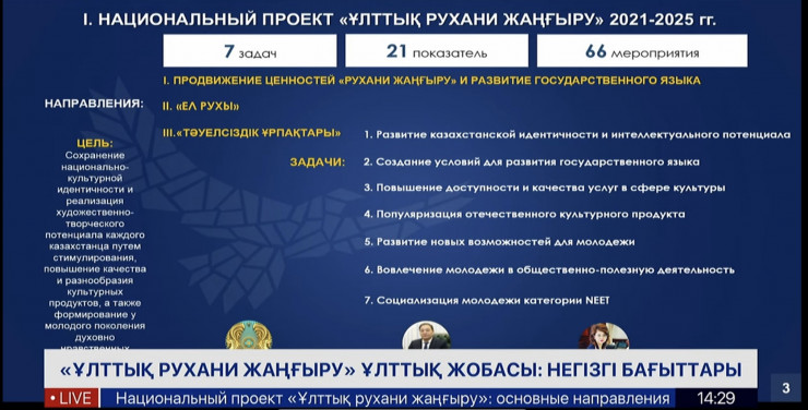 Национальный проект "Ұлттық рухани жаңғыру", по ее словам, рассчитан на 2021-2025 годы. Среди задач проекта развитие казахстанской идентичности и интеллектуального потенциала, создание условий для развития казахского языка, развитие новых возможностей для молодежи и другое.